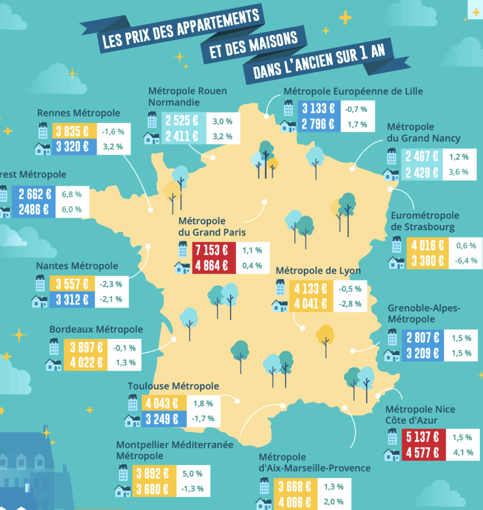 La hausse des prix des appartements concerne alors 75 % des villes de plus de 100 000 habitants (contre 63 % en mai dernier). Néanmoins, quelques grandes villes ne sont toujours pas concernées par la remontée ou par l’inversion de la courbe des prix des appartements anciens, pour des raisons économiques ou en raison du délaissement d’une partie de la demande. Le mouvement de baisse se renforce ainsi à Amiens et à Saint-Etienne, mais aussi à Lille, à Nantes et au Havre, voire à Rennes.