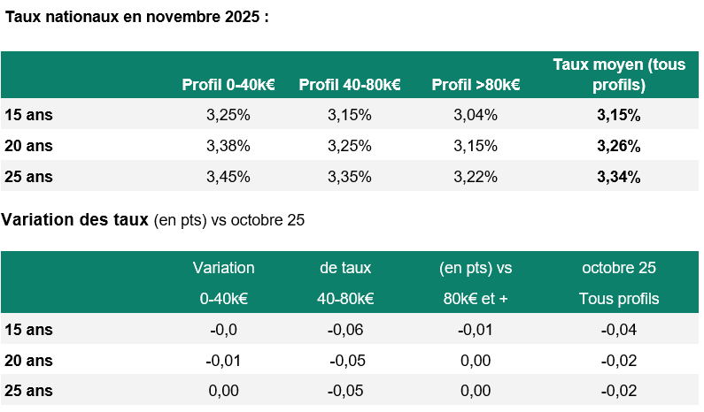 Selon les données de Pretto, les taux moyens constatés en novembre s’établissent comme suit 3,15% sur 15 ans, 3,26% sur 20 ans et 3,34% sur 25 ans.