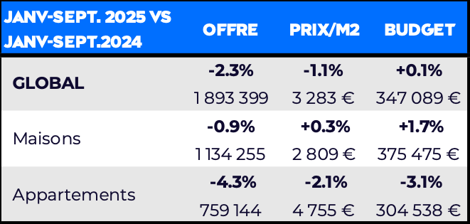 La légère baisse du prix au mètre carré (-1.1%) et la stabilité du budget moyen d’achat, établi à environ 347 000 € sur la période janvier-septembre 2025, contribuent à cette évolution favorable. Autant de signaux qui confirment un marché plus équilibré et plus accessible qu’un an plus tôt.