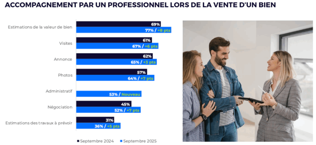 Face à ce contexte de marché, les vendeurs privilégient toujours plus l’appui d’un professionnel de l’immobilier. Estimation du bien (77%), gestion des visites (67%) ou encore diffusion des annonces (65%) : les agents immobiliers demeurent des partenaires experts pour sécuriser chaque étape du processus. Il ne s’agit pas seulement de vendre, mais de guider, conseiller et rassurer des clients en quête de sécurité.