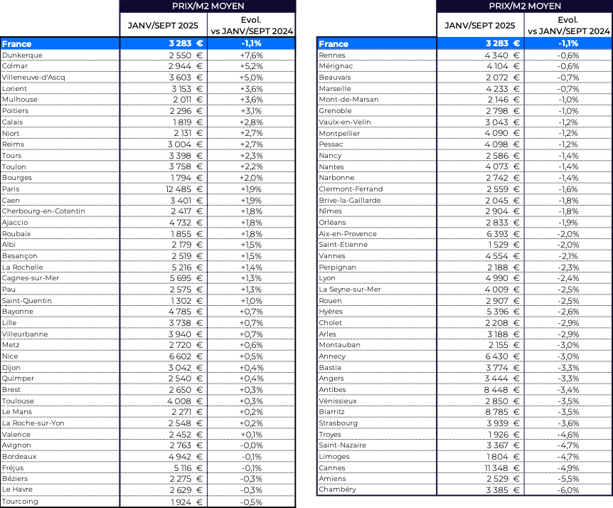 Au cours des 9 premiers mois de 2025, les prix/m² poursuivent leurs hausses essentiellement dans les régions parmi les plus accessibles avec la Bourgogne-Franche-Comté (+1.7% à 1 785 €/m² vs -1.1% à 3 283 € pour la moyenne nationale), les Hauts-de-France (+1.4% à 2 252 €/m²), ou encore la Normandie (+0.7% à 2 397 €/m²). A l’inverse, l’Ile-de-France, la région la plus onéreuse avec 5 646 €/m², voit le prix/m² se stabiliser en 1 an et la Provence-Alpes-Côte d’Azur marque le pas (-0.6% à 5 397 €/m²).