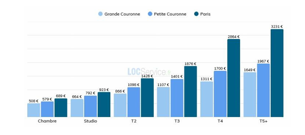 Le graphique ci-dessous illustre ces écarts, notamment entre Paris intra-muros et la périphérie, avec des différences particulièrement marquées sur les grandes surfaces (T3 et plus).