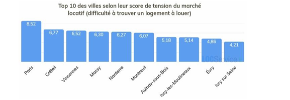 En tête : Paris, Créteil et Vincennes, avec une tension en forte hausse. Après avoir occupé la 3e place il y a deux ans, Paris retrouve sa position dominante, tandis que l’ensemble des villes du top 10 enregistre une augmentation de la pression sur le marché locatif.