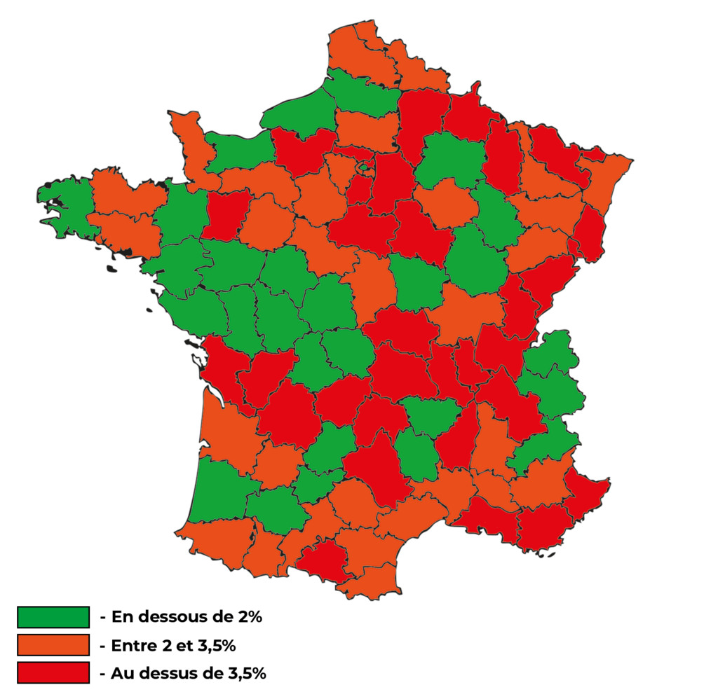 Les contrastes sont également marqués au sein même des régions : en Île-de-France, les taux oscillent entre 1,62 % à Paris et 5,80 % en Seine-Saint-Denis.