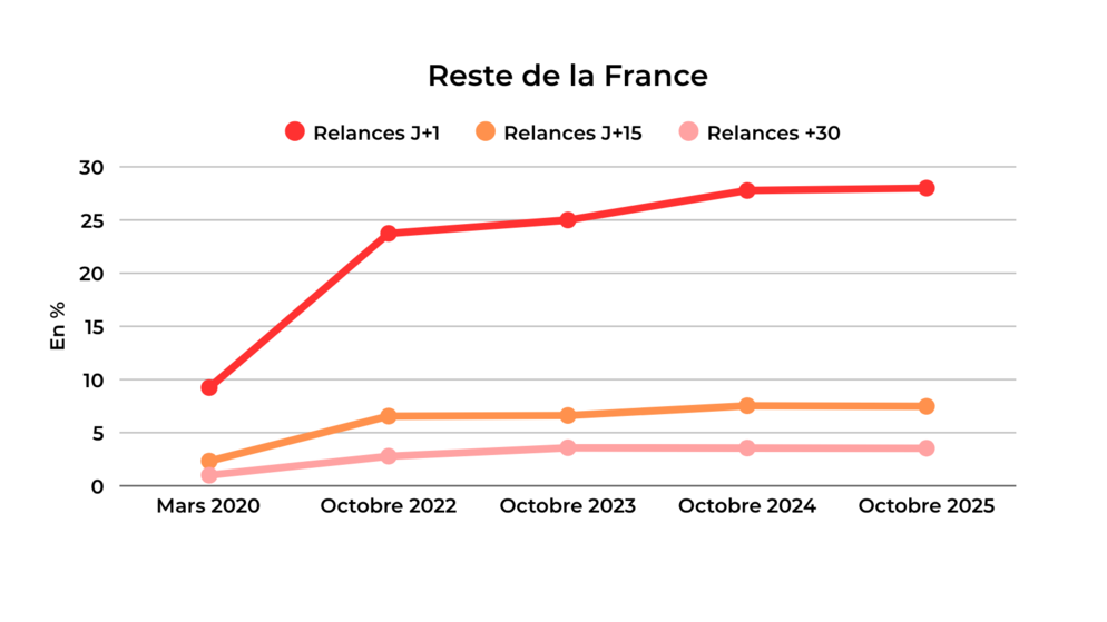 Dans le reste du territoire, la tendance demeure défavorable. Le taux d’impayés de plus d’un mois atteint 4,01 % en octobre 2025, en hausse par rapport à 3,80 % un an plus tôt, et très loin des 1,25 % d’avant COVID.
