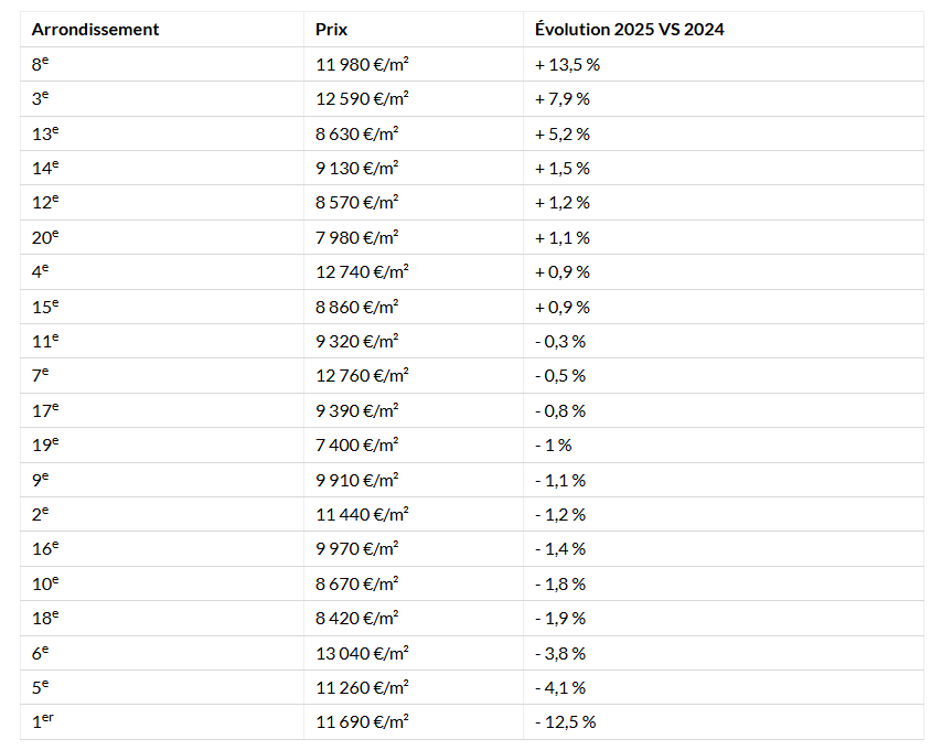 - 8e, 11e, 14e, 16e : marché attentiste, variations entre 0 et –3 %. Les acheteurs espèrent une nouvelle baisse, les prix restant élevés sans avantage particulier.