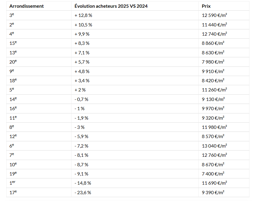 - 9 arrondissements sur 20 gagnent des acheteurs en 2025.