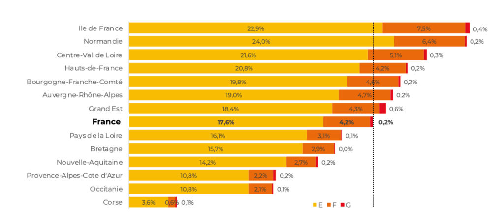 L’impact de l’interdiction progressive des « passoires » énergétiques est bien différent selon les régions. Par exemple, l’Ile-de-France voit plus de 30% de son offre locative concernée à terme par les interdictions tandis qu’il s’agit « seulement » de 4.3% des biens proposés en Corse.