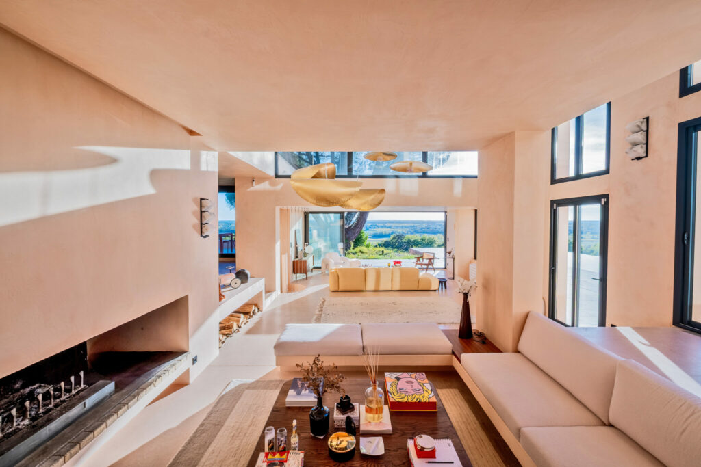 Béton ciré, noyer, hêtre, pierre naturelle et enduits à la chaux composent une harmonie sophistiquée, sublimée par de vastes baies vitrées qui baignent les espaces de lumière tout au long de l’année.