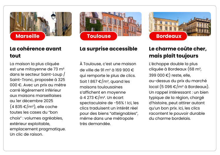 Du côté des maisons, le podium 2025 dessine une dynamique différente : Marseille, Toulouse et Bordeaux sont les trois villes dont les annonces ont généré le plus de clics. Là encore, les motivations varient selon les territoires, mais une constante demeure : les Français cliquent lorsqu’un bien raconte une histoire ou semble être une opportunité.