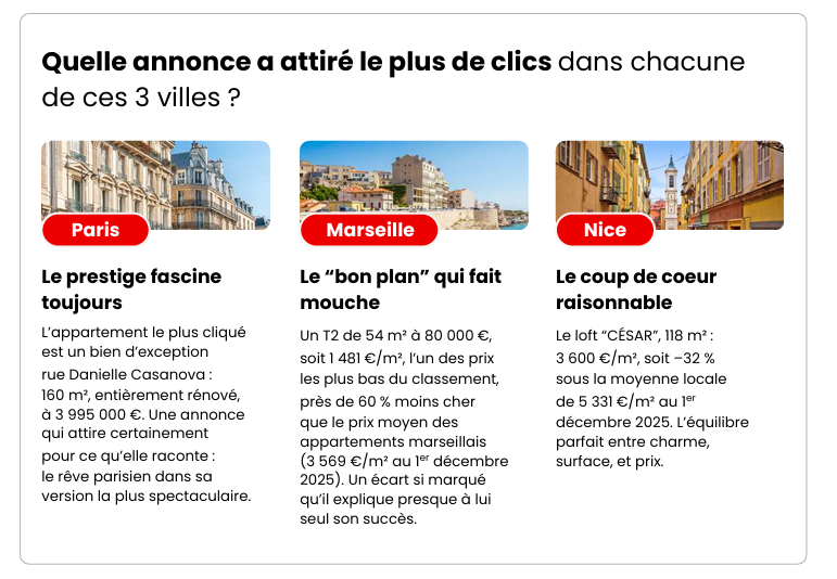 A retenir : C’est exactement le type de bien sur lequel les Français ont cliqué en 2025 : un bien à un prix nettement inférieur au marché local.