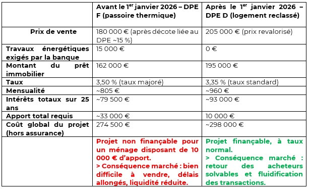 Le reclassement DPE peut renchérir le prix facial et le coût total du projet, mais il transforme surtout un dossier non finançable en projet accessible. L’effet principal de la réforme est l’amélioration de la fluidité du marché.