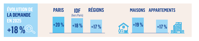 Par typologie, la demande progresse de 19 % pour les maisons et de 17 % pour les appartements. Cela montre que les Français se tournent à nouveau vers les maisons, qui restent la forme dominante du parc immobilier, après une période où l’inflation et les coûts liés à l’entretien et à la rénovation avaient temporairement freiné cet intérêt.