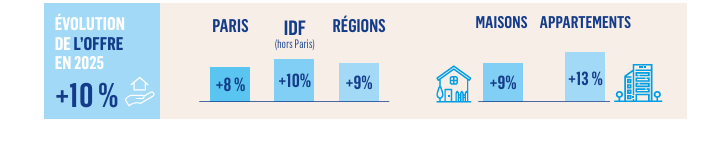 Face à cette demande dynamique, l’offre de biens à vendre progresse également : +10 % au national. Les stocks de maisons augmentent de 9 % et ceux des appartements de 13 %. Après plusieurs trimestres de raréfaction, notamment dans les grandes métropoles, les stocks se reconstituent, mais demeurent nettement insuffisants pour répondre aux besoins du marché.