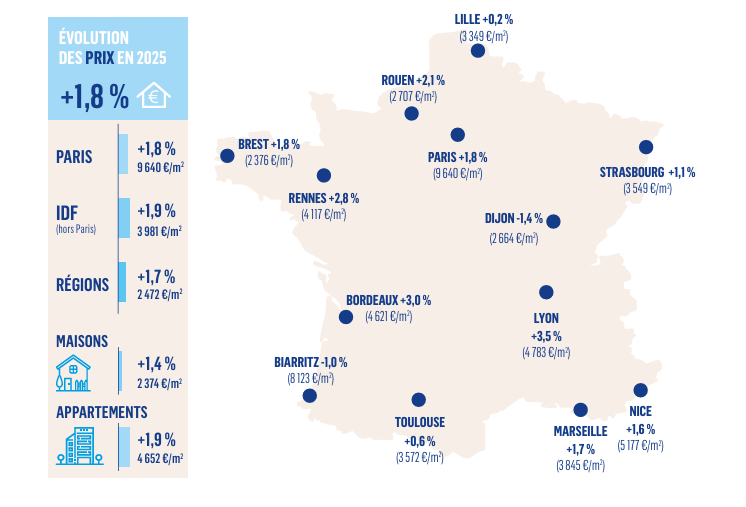 En Île-de-France, les prix augmentent de 1,9 %, pour atteindre 3 981 €/m², avec des évolutions contrastées : les Yvelines et le Val-d’Oise enregistrent seulement +0,9 % en un an. En régions, après une baisse de 3,6 % en 2024 et une stagnation en milieu d’année 2025 (-0,9 %), les prix repartent à la hausse (+1,7 %, à 2 472 €/m²). Cette augmentation reste hétérogène : les prix progressent nettement à Lyon (+3,5 %) et à Bordeaux (+3,0 %), de manière un peu plus modérée à Marseille (+1,7 %) et à Strasbourg (+1,1 %), ils stagnent à Lille (+0,2 %) et à Toulouse (+0,6 %), et reculent légèrement à Biarritz (-1,0 %) et à Dijon (-1,4 %).