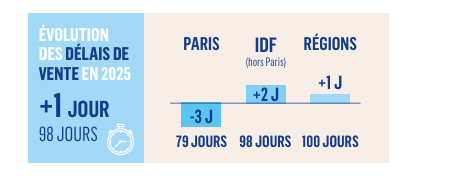 Les délais de vente confirment un marché qui a redémarré, mais où prudence et observation restent de mise. Au niveau national, le délai moyen est de 98 jours, soit 1 jour de plus qu’il y a un an. À Paris, les biens se vendent en moyenne en 79 jours (-3 jours), en Île-de-France en 98 jours (+2 jours) et dans les régions en 100 jours (+1 jour). Les appartements se vendent plus rapidement (94 jours en moyenne) que les maisons (99 jours).