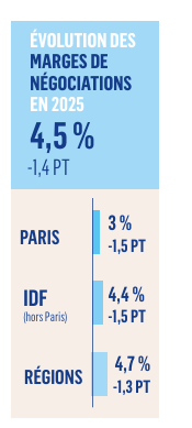 La marge de négociation poursuit son recul. Au niveau national, elle s’établit à 4,5 % (-1,4 point). Dans les régions, elle atteint 4,7 % (-1,3 point), en Île-de-France 4,4 % (-1,5 point), et seulement de 3 % à Paris (-1,5 point). Les maisons font l’objet de négociations un peu plus fortes (4,9 %) que les appartements (4,1 %). Deux phénomènes expliquent cette évolution.