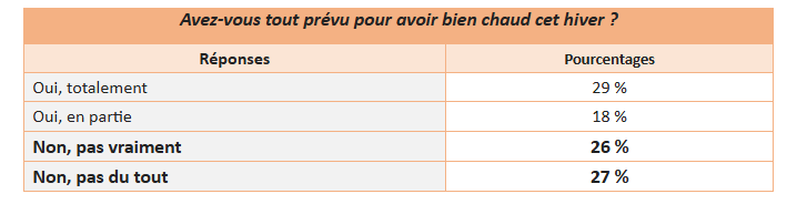 Si 29 % des foyers affirment avoir tout prévu pour avoir bien chaud cet hiver, 53 % reconnaissent ne pas être vraiment prêts… voire pas du tout. En effet, 27 % n’ont rien anticipé et 26 % avouent être bien mal organisés.