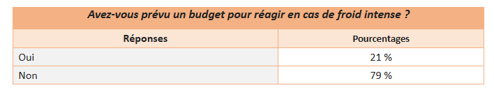 À la question « Avez-vous prévu un budget pour réagir en cas de froid intense ? », 21 % des répondants indiquent avoir déjà mis en place une enveloppe dédiée pour faire face à une éventuelle vague de froid. Pour les autres, c’est surtout l’occasion d’identifier des leviers simples d’anticipation et de mobilisation rapide, afin d’ajuster leurs usages et leurs dépenses au fil de l’hiver, sans mauvaise surprise pour le confort comme pour le budget.