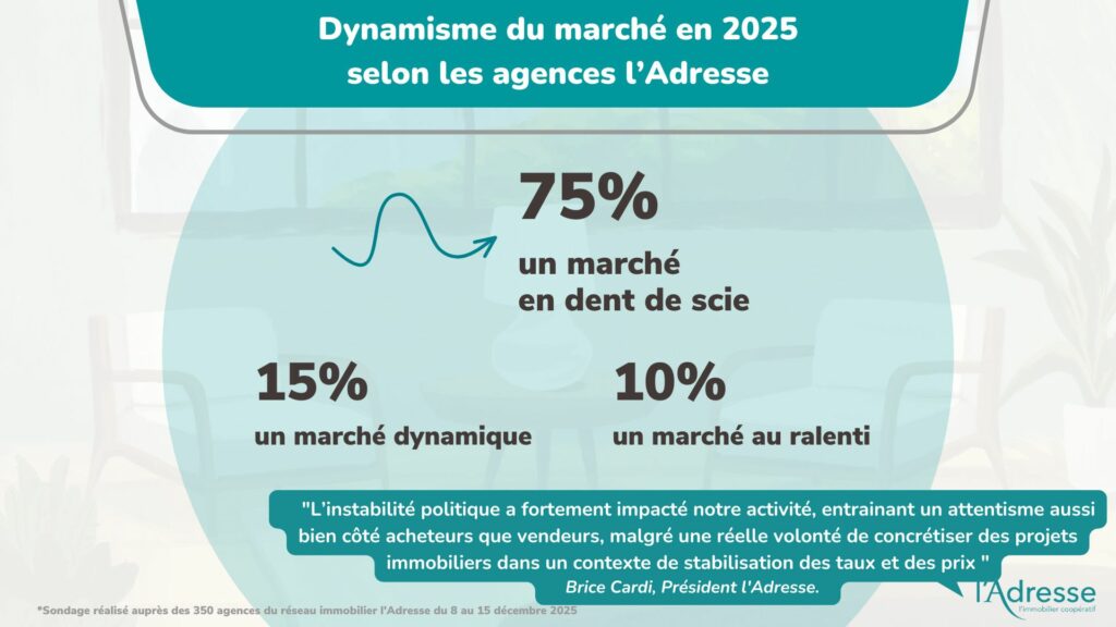 « Le marché immobilier est reparti en 2025 mais il a été irrégulier, alternant dynamisme et attentisme. Si les taux de crédit et le volontarisme des banques ont permis le retour des acheteurs, l’instabilité politique et économique a créé un climat d’attente généralisée, dans lequel chaque décision immobilière a été mûrement réfléchie. Certaines ont même été suspendues et reportées à plus tard, faisant de 2025 une année de reprise certes, mais en demi-teinte », analyse Brice Cardi, président du réseau L’Adresse.