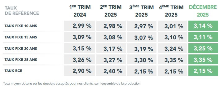 Décembre s’inscrit dans la continuité des derniers mois de 2025, avec des taux de crédit immobilier attractifs qui évoluent très peu d’un mois sur l’autre. En décembre, CAFPI a ainsi obtenu en moyenne pour ses clients des taux de : 3,11 % sur 15 ans (+4 centièmes par rapport à novembre 2025), 3,25 % sur 20 ans (+1 centième) et 3,35 % sur 25 ans (+1 centième).