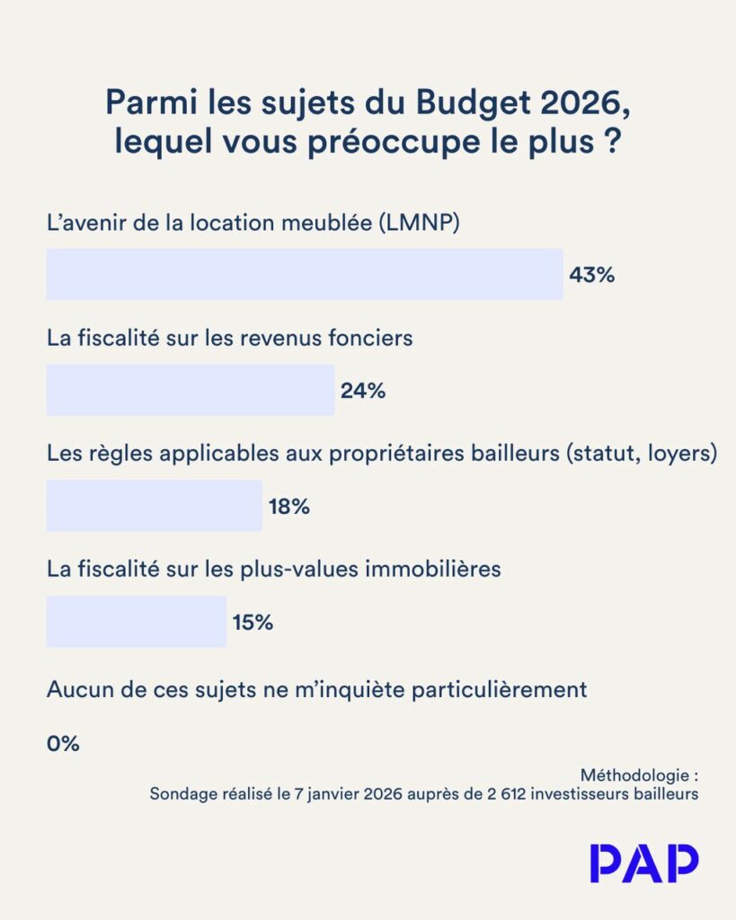Parmi les mesures évoquées dans le cadre du Budget 2026, la location meublée non professionnelle (LMNP) arrive largement en tête des préoccupations. 43 % des investisseurs la citent comme leur principale source d’inquiétude.