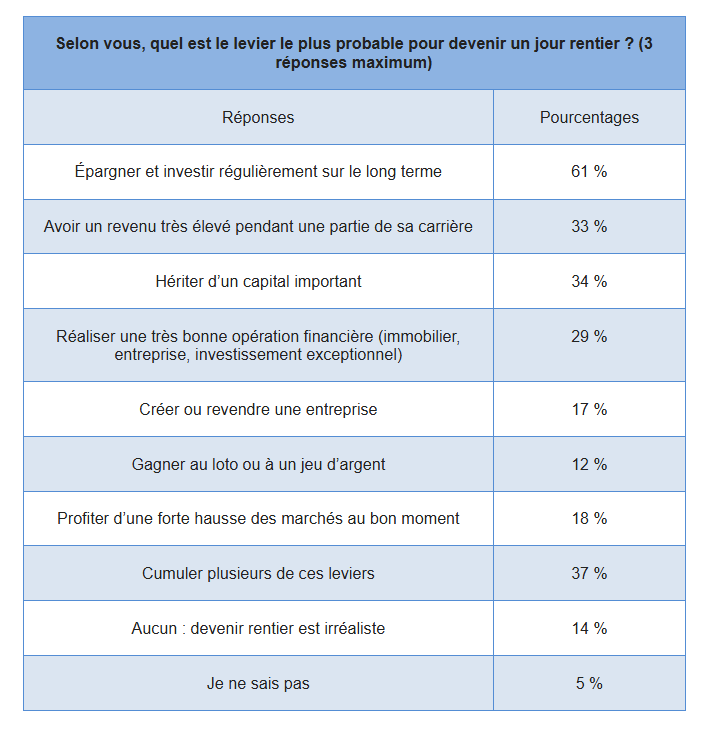 Les Français identifient clairement les mécanismes théoriques permettant d’atteindre la rente. L’épargne régulière arrive largement en tête, mais elle est rarement perçue comme suffisante sans autres leviers.