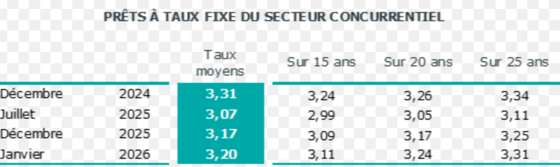 En janvier 2026, selon l’Observatoire Crédit Logement / CSA, le taux moyen des crédits du secteur concurrentiel s’est établi en janvier 2026 à 3.20 % (3.19 % pour l’accession dans le neuf et dans l’ancien).