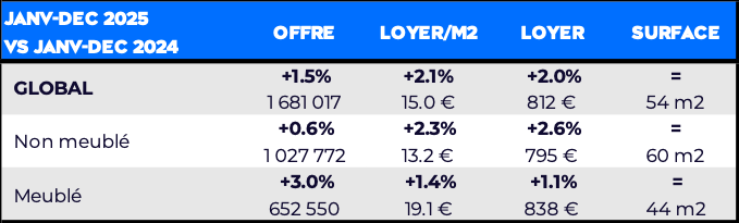 Si la transaction retrouve progressivement de la fluidité, le marché locatif demeure le principal point de tension du logement en France. À fin 2025, l’offre de logements à louer n’a progressé que de +1.5% sur un an, tandis que les loyers ont augmenté de +2.0%, pour atteindre en moyenne 812 €.