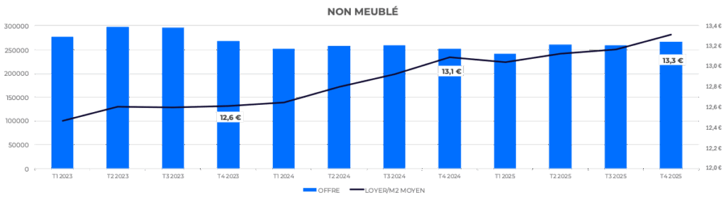 La location non meublée recule dans de nombreuses zones tendues. Soumise à des obligations croissantes, à une fiscalité moins attractive et à des coûts de travaux élevés, elle fait l’objet d’arbitrages défavorables : certains bailleurs privilégient le meublé ou la revente, réduisant l’offre disponible de biens loués vides. Dans le même temps, sa valeur augmente : 13.2 €/m² en moyenne, soit +2.3% en un an.