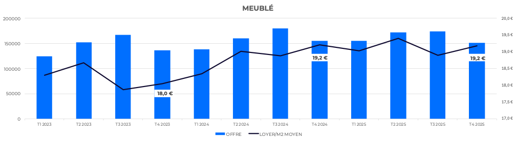 A l’inverse, la location meublée continue de progresser en volume, notamment dans les grandes villes, les zones étudiantes et touristiques. Plus flexible, moins contraignante pour le propriétaire, et souvent perçue comme plus rentable, elle capte une part croissante du parc locatif. Elle voit elle aussi la valeur augmenter mais dans une moindre mesure : 19.1 €/m² en moyenne, à +1.4% en un an.