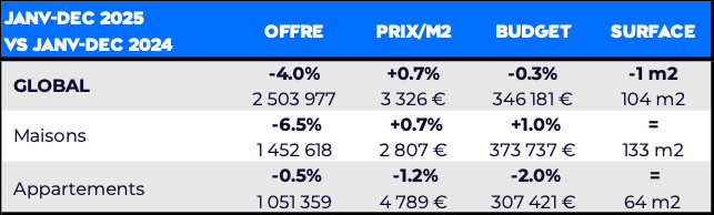 Derrière les moyennes nationales de 2025 (-4% de biens mis en vente, +0.7% sur les prix/m²), les dynamiques locales restent contrastées.