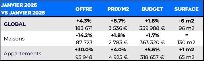 Dès janvier 2026, les indicateurs confirment un regain d’activité. L’offre progresse de +4.3% sur un an, atteignant 183 671 biens disponibles. Parallèlement, les prix repartent à la hausse (+8.7%, à 3 536 €/m²).