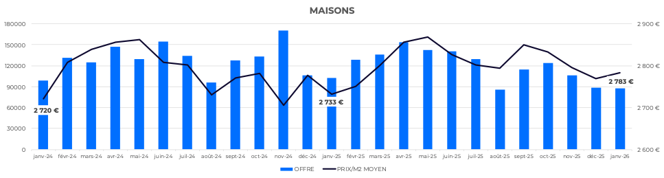 Début 2026, cette dynamique se prolonge dans un contexte de forte tension sur l’offre. Le nombre de maisons disponibles est en retrait de -14.2% par rapport à janvier 2025. Les prix poursuivent alors leur progression (+1.8%, à 2 783 €/m²) et le budget moyen atteint 363 320 € (+1.7%), pour une surface toujours élevée (130 m²).