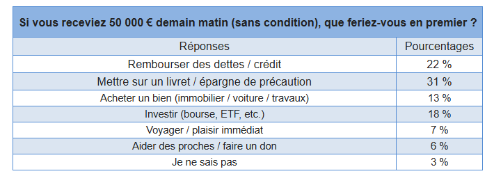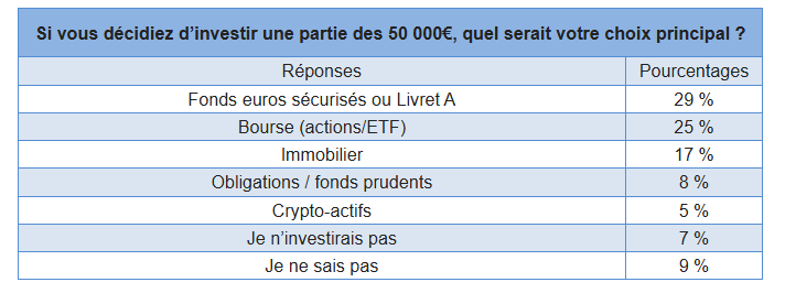 Premier constat : l’investissement n’est pas le premier réflexe. 31 % placeraient la somme sur un livret, 22 % rembourseraient leurs dettes. Seuls 18 % investiraient immédiatement.