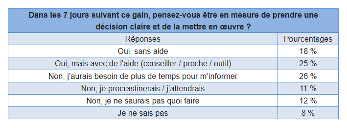 Si 43 % des Français disent pouvoir élaborer un plan d’action avec de l’aide (25 %) ou seuls (18 %), les 57 % restants avouent être incapables de prendre une décision face à une rentrée d’argent importante.