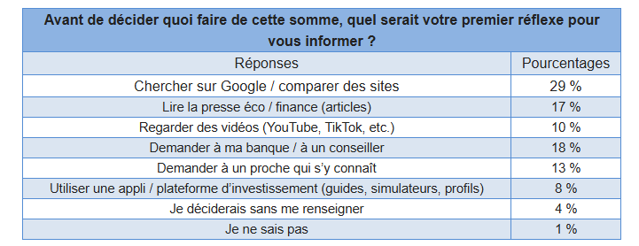 Premiers signaux forts : 94 % ne se sentent pas complètement capables d’évaluer la fiabilité d’un conseil financier et 29 % choisiraient Google comme premier réflexe. Bonne nouvelle, 38 % des Français s’informent régulièrement avec les médias spécialisés.