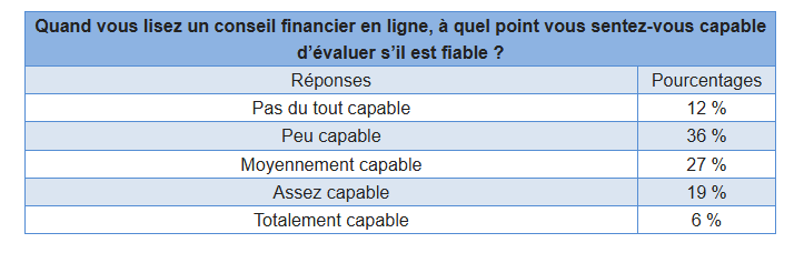 C’est l’un des signaux les plus forts de l’étude. Seuls 6 % se disent « totalement capables » d’évaluer la fiabilité d’un conseil financier en ligne.