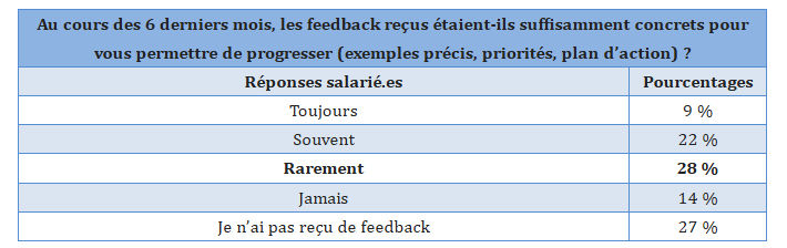 Plus chanceux que d’autres, 31 % des salariés déclarent recevoir souvent (22 %) ou toujours (9 %) des retours exploitables pour leur permettre de progresser dans leur travail. Ainsi, 69 % sont laissés dans le flou : 27 % sans aucun feedback, 28 % rarement et 14 % jamais.