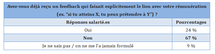 Côté argent, moins d’un salarié sur quatre (24%) a déjà reçu un feedback reliant explicitement performance et rémunération, contre 67 % qui n’ont jamais eu ce cap, et 9 % à qui cela n’a même jamais été formulé.