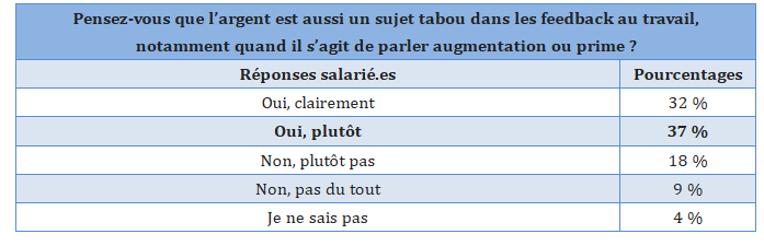 Pour 69 % des salariés, l’argent reste aussi un sujet tabou dans les feedback reçus ou exprimés, dès qu’il s’agit d’augmentation ou de prime (32 % « clairement », 37 % « plutôt »). Néanmoins, 29 % estiment que ce n’est pas un problème.