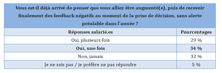 Près de deux salariés sur trois (63 %) ont déjà pensé être augmentés avant de recevoir, au moment de la décision, des feedback négatifs sans aucune alerte préalable dans l’année (29 % plusieurs fois, 34 % une fois). Un scénario explosif qui mélange frustration immédiate, confiance abîmée, et inévitablement des envies de départ décuplées.