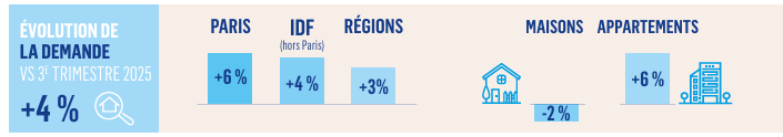 La demande progresse sur les appartements (+6 %), tandis qu’elle recule sur les maisons (-2 %). Un écart qui reflète à la fois la contrainte financière des acquéreurs et la saisonnalité naturelle du marché : les maisons trouvent traditionnellement leur public au printemps, lorsque les projets familiaux s’accélèrent.