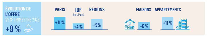 Face à la demande, l’offre poursuit sa progression entamée en 2025, avec une accélération sensible en ce début d’année. Au niveau national, elle progresse de +9 % en trois mois, avec des évolutions contrastées selon les territoires : +11 % à Paris, +9 % en régions, +4 % seulement en Île-de-France.