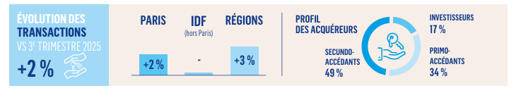 À Paris, la dynamique est contrastée : l’offre s’est fortement étoffée, la demande progresse, mais les transactions ne suivent pas au même rythme. En Île-de-France, le ralentissement saisonnier sur les maisons individuelles pèse mécaniquement sur l’activité de ce début d’année. Les régions affichent quant à elles un rebond des transactions, confirmant que la reprise observée en 2025 est bien réelle, malgré un marché encore en ajustement.