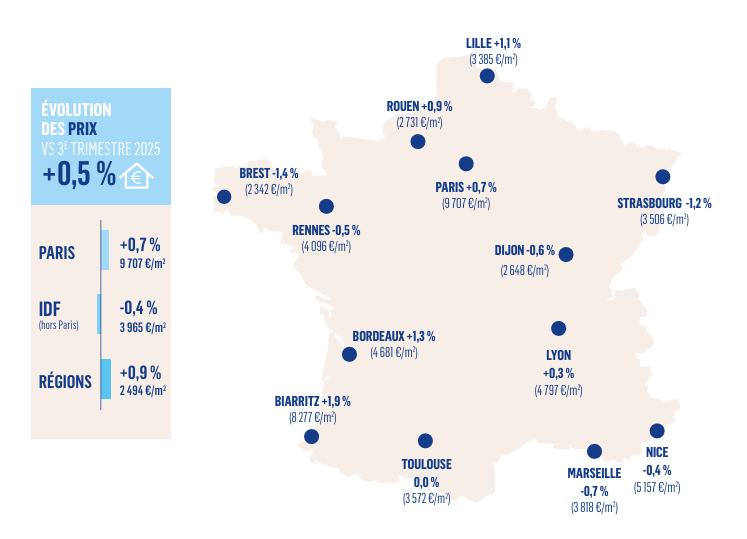 La lecture territoriale reste contrastée. Bordeaux (+1,3 %) et Lille (+1,1 %) tirent vers le haut, quand Lyon (+0,3 %), Toulouse (0 %), Marseille (-0,7 %) ou Strasbourg (-1,2 %) illustrent des marchés qui cherchent encore leur point d’équilibre. Dans ce contexte, les acquéreurs restent attentifs à l’évolution des prix. Les tensions sur le pouvoir d’achat contiennent naturellement les velléités de hausse marquée.