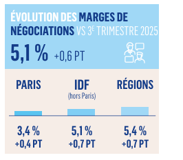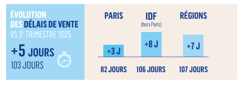 Autre signal à noter : les délais de vente s’allongent. Au niveau national, ils atteignent 103 jours, soit +5 jours en 3 mois : 82 jours à Paris (+3 jours), 106 jours en Île-de-France (+8 jours) et 107 jours en régions (+7 jours). Cette évolution traduit un changement d’attitude des acquéreurs, qui prennent davantage de temps pour comparer, négocier et sécuriser leur financement, en intégrant l’ensemble des coûts (travaux, énergie, fiscalité).