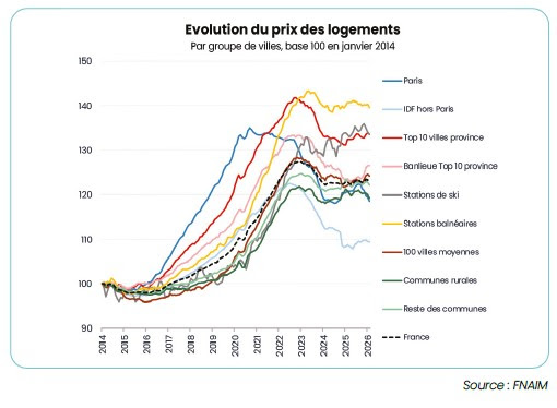 - Les prix des logements sont globalement stables début 2026 (-0,1 % sur un an), avec des hausses localisées dans les grandes villes et leurs périphéries.