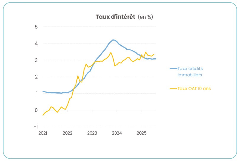 Par ailleurs, les taux des crédits immobiliers, orientés légèrement à la hausse depuis quelques mois, s’établissent autour de 3,2 %. Dans ce contexte de progression modérée des taux, des prix et des revenus, le pouvoir d’achat immobilier cesse de s’améliorer et se stabilise, après son redressement observé en 2024.
