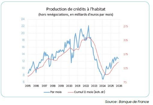 Après avoir été divisée par trois en deux ans, sous l’effet de la chute des ventes dans l’ancien et du ralentissement du neuf, la production de crédits à l’habitat montre des signes de redressement. Son niveau reste toutefois modéré, autour de 13 milliards d’euros hors renégociations, ce qui conduit à une stabilisation des encours : les remboursements sont désormais proches des montants accordés via les nouveaux prêts.